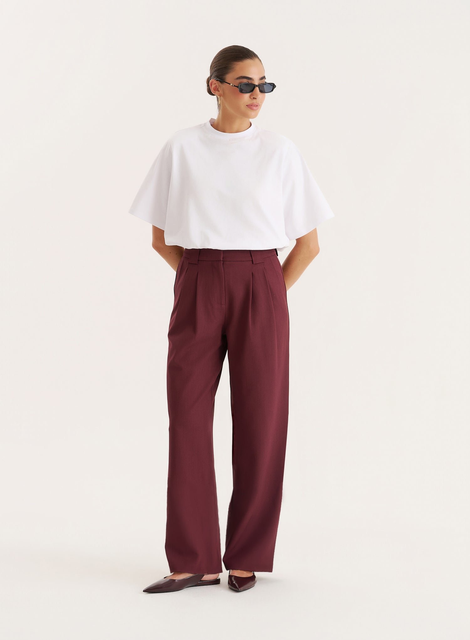 In a flattering wide leg shape, the Maggie trousers come in an autumn-ready plum colourway – the perfect transitional styling piece. Taking on our signature tailored design, they feature belt loops, button-zip fastening and pleated details for a smarter take on an everyday trouser. Mix and match with the Maggie blazer by day and the matching corset top by night.
