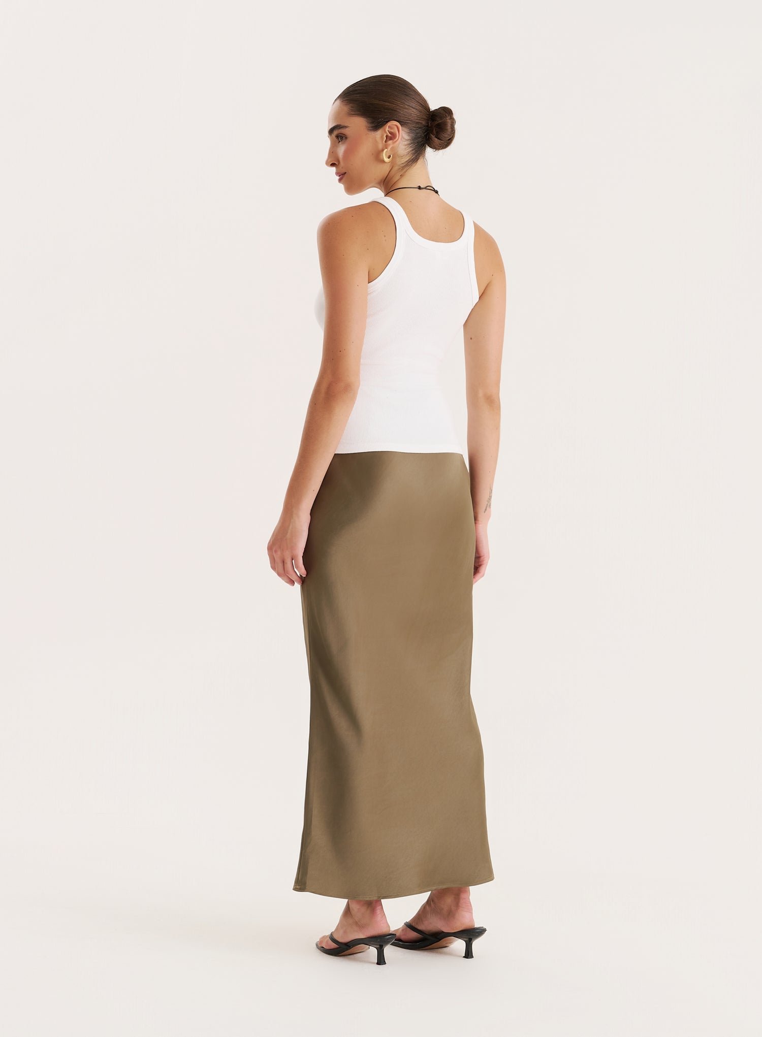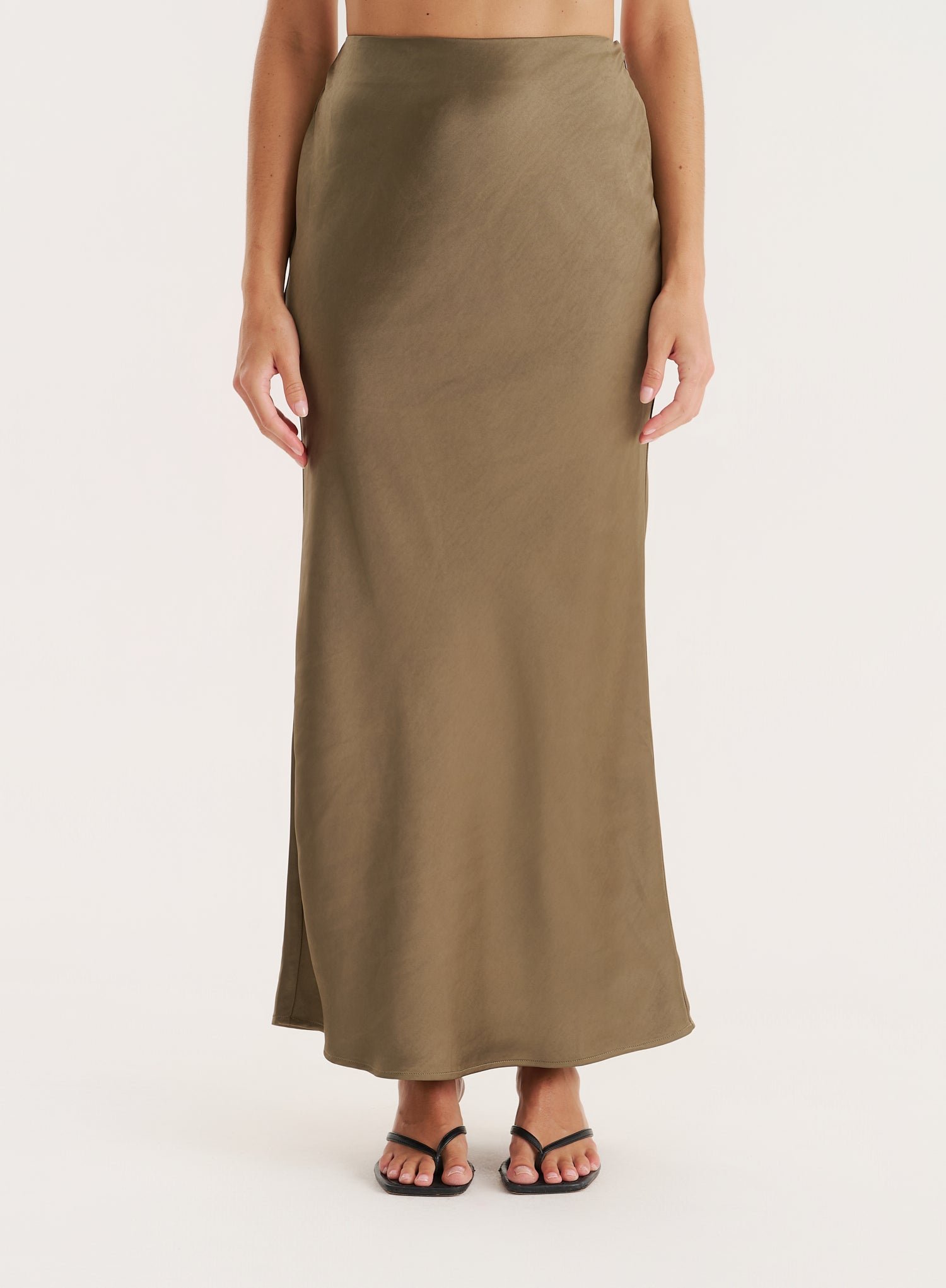 Cut to a flattering midaxi length, the Novah satin skirt is the ultimate wardrobe essential for trans-seasonal dressing. In a body skimming, straight silhouette, it’s updated in refined khaki hue – pairing well with everything from basic white tees to our everyday vests. Wear with pointed slingbacks and your favourite accessories for a day to evening look.